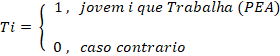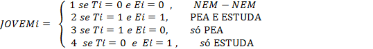 A variável dependente assume valores ordenados de um a quatro, considerando que os indivíduos têm quatro opções que se enquadram entre as determinadas características definidas como: Jovem que Nem estuda Nem participa da PEA (j =1 ), Jovem que estuda e participa da PEA, (j =2) Jovem não estuda e trabalha (j =3), Jovem que estuda e não participa da PEA (j =4). Neste trabalho, optou-se por deixar como categoria base o Jovem que somente estuda (j =4).