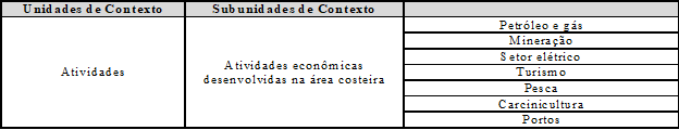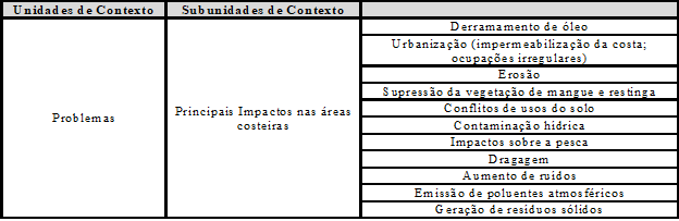 A análise de conteúdo do Plano Nacional de Gerenciamento Costeiro (PNGC) e o seu respectivo relatório “25 anos do Gerenciamento costeiro no Brasil” permitiu inferir que neste ínterim diversas são as ações desenvolvidas no intuito de regular as atividades nessas áreas com o intuito de manter as características intrínsecas dessa região tão importante do ponto de vista econômico, social e ambiental. A partir dessa análise, foi possível identificar as principais atividades econômicas desenvolvidas na zona costeira brasileira (Quadro 01), bem como os principais problemas ocorridos nessas áreas (Quadro 02).