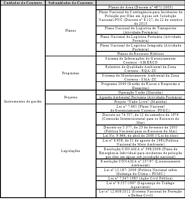 As unidades de contexto extraídas da amostra documental foram: 1- Atividades; 2- Problemas; 3- Instrumentos de gestão; 4- Instituições; 5- Carências. Sendo assim, seguiu-se à análise, identificando-se, também, as subunidades de contexto (temas específicos dentro de cada unidade).