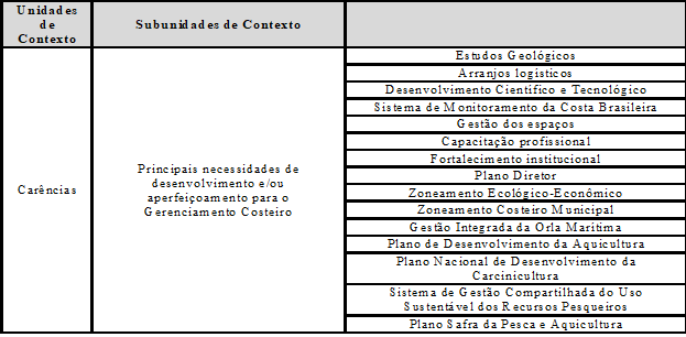Nos 25 anos da gestão costeira integrada no Brasil foi possível identificar algumas carências dessa região, conforme mostra o Quadro 05 abaixo: