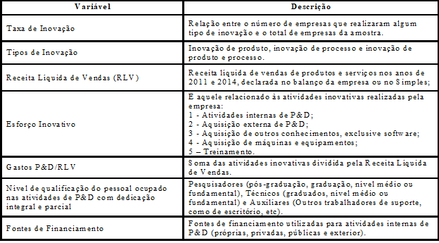 A metodologia utilizada baseia-se na análise descritiva de indicadores de resultado (taxa de inovação e tipos de inovação) e esforço inovativo (atividades internas de P&D, aquisição externa de P&D, aquisição de outros conhecimentos externos, aquisição de máquinas e equipamentos, e treinamento), conforme descrito no quadro 1, que nos permitirá fazer algumas inferências acerca do padrão da atividade de inovação adotado pelas firmas da região e suas possíveis implicações no desenvolvimento da região estudada.