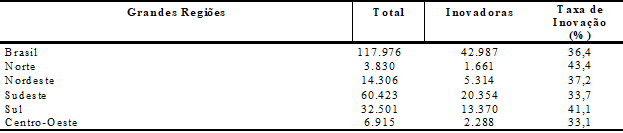 Estudos recentes (AVELLAR; BOTELHO, 2016) mostram que a taxa de inovação no Brasil situa-se muito aquém dos investimentos realizados pelos países desenvolvidos. Essa diferença torna-se mais latente quando se compara a participação da iniciativa privada no processo de pesquisa e desenvolvimento. Nesse sentido, conforme dados apresentados na tabela 1, apenas 36,4% das empresas brasileiras introduziram inovações no período de 2012-2014. Quando se analisa a taxa de inovação - obtida pela relação entre o número de empresas que realizaram algum tipo de inovação e o total de empresas da amostra, das grandes regiões brasileiras, verifica-se que as regiões Norte (43,4%,), Sul (41,1%) e Nordeste (37,2%) foram aquelas nas quais as empresas mais implementaram algum tipo de inovação no período analisado.