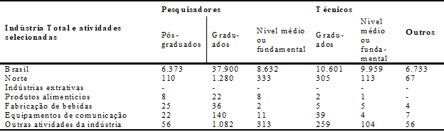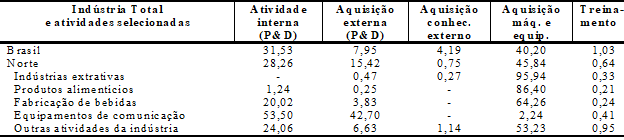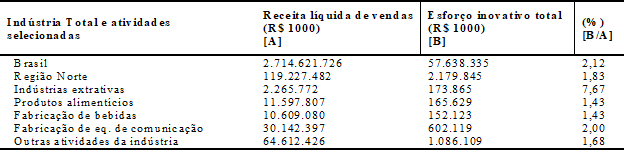 Mesmo as indústrias brasileiras tendo implementado algum esforço de inovação, verifica-se que os gastos como percentual da receita líquida empregados nas atividades inovativas das indústrias brasileiras é de apenas 2,12%. Quando se verifica o comportamento desse indicador para a Região Norte do Brasil, esse percentual é inferior à média nacional (1,83%), sendo puxado, sobretudo, pelo investimento realizado pela indústria extrativa (7,67%), o que é compatível com a matriz econômica da região (tabela 2).