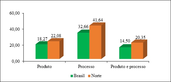 Quanto ao tipo de inovação, percebe-se (gráfico 1) que 41,64% dos esforços empreendidas pelas empresas da Região Norte referem-se à inovação de processo, enquanto que apenas 20,35% inovaram em produto e processo. Esse mesmo comportamento é observado a nível nacional, em que a inovação de processo (32,66%) se sobressai em detrimento das demais. Isso significa que o padrão inovativo da região é caracterizado, basicamente, pela incorporação de máquinas e equipamentos ao processo produtivo, sendo que na maior parte das vezes são novidades apenas para a empresa. Ou seja, tanto a nível nacional como regional a lógica inovativa é pautada, em grande parte, na absorção e aperfeiçoamento da inovação.