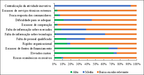 A partir da constatação de que os elevados custos são os principais entraves ao processo de inovação, pode-se afirmar que, de fato, promover inovação requer um emprego considerável de recursos, sobretudo quando se está inserido dentro de setores mais avançados. No entanto, é possível notar que as empresas da região, em grande parte familiares, encaram os investimentos em inovação apenas pela ótica do aumento de custos, sem considerar, no entanto, os benefícios e retornos que tal processo pode lhes proporcionar em termos de ganhos de mercado. Tudo isso contribui para que haja poucas mudanças na base produtiva regional, o que implica substancialmente no dinamismo econômico local e, consequentemente, na geração de postos de trabalho.