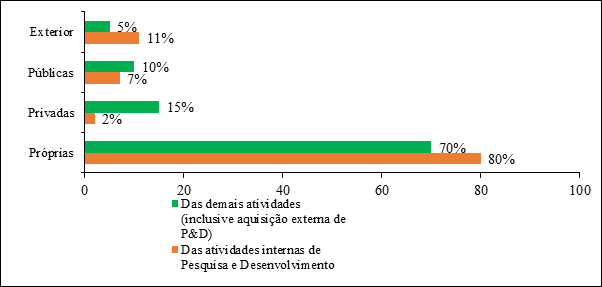 A indicação da escassez de financiamento como um dos principais obstáculos para se inovar pode ser ratificada pelo fato de que 80% das atividades internas de P&D e 70% das demais atividades são financiadas com fontes próprias de recursos. Apenas 7% das empresas da região receberam financiamentos públicos para custear atividades internas de P&D, enquanto que 10% se utilizaram dessas mesmas fontes para o desenvolvimento de outras atividades, inclusive P&D externo. Destaque importante pode ser atribuído ao fato de que 11% do financiamento de atividades de internas de P&D são oriundos do estrangeiro (gráfico 3). Além da dificuldade de se firmar parceria e relações de cooperação, conforme destacado anteriormente, esses dados podem sugerir a falta de políticas de apoio governamental para a região, sobretudo para as empresas de menor porte, no sentido de dinamizar e melhorar as condições de infraestrutura produtiva da região.