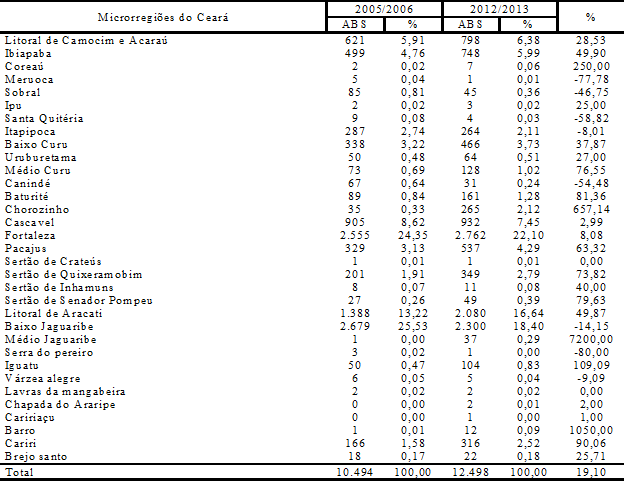 Assim, no que se refere à capacidade de geração de emprego da agropecuária cearense, pode ser ela observada a partir da tabela 1, em que se utilizou a média aritmética do número absoluto de pessoas empregadas formalmente no setor agropecuário nos anos 2005 e 2006 e nos anos 2012 e 2013 para cada microrregião do Ceará. A partir dessas médias, calculou-se o percentual em relação ao total de empregos formais. Além disso, apresenta-se a variação, com relação ao emprego formal, entre 2005/2006 e 2012/2013.