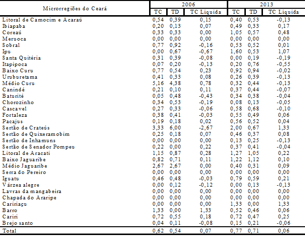 Na tabela 2, a TC (Taxa de Criação) foi determinada por meio da razão entre o número de trabalhadores admitidos e a média do total de empregos formais nos anos 2006 e 2013. A mesma metodologia foi aplicada à TD (Taxa de Destruição), sendo que esta é o resultado da razão entre o número de funcionários demitidos e a média do total de empregos formais nos anos 2006 e 2013. No tocante à TCL (Taxa de Criação Líquida), foi ela obtida por meio da diferença entre a TC e a TD no mesmo período de tempo em que se encontram estas duas últimas taxas.