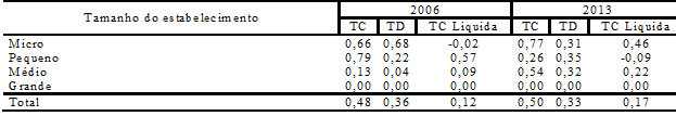 No que se refere à TD, tem-se que a maior redução dos postos de trabalho (0,68) ocorreu, no ano de 2006, no microestabelecimento. Em 2013, a TD mais significativa (0,35) ficou com o pequeno estabelecimento seguido do médio (0,32).