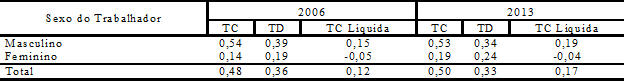 Quanto ao sexo do trabalhador, conforme a tabela 4 houve uma maior capacidade do sexo masculino quanto à taxa de criação em ambos os anos, o qual levou a apresentar uma TCL de 0,15 em 2006 e de 0,19 em 2013; enquanto, a TCL do sexo feminino foi negativa nos dois períodos em apreço por apresentar TC’s superior as TD’s.