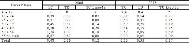 De acordo com a tabela 5, relativamente à faixa etária de 50 a 64 anos de idade, a TD (1,07) no ano de 2006 foi a mais elevada; mas, permaneceu inferior à TC (1,24), contribuindo para um saldo positivo da TCL em 0,18. O mesmo caso ocorreu em 2013 com a faixa etária de 18 a 24 anos de idade: a TC (0,81) foi superior à TD (0,54), ainda que esta última tenha exibido, dentre as demais, um forte declínio em relação aos empregos formais. Vale ressaltar que a faixa etária dos 65 anos de idade ou mais no ano 2006 apresentou TCL nula. É que a criação e destruição de postos de trabalho se der na mesma proporção, ou seja, TC da ordem de 0,67; o mesmo ocorreu com a TD. No o ano de 2013, a TC foi nula.