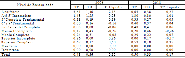 Já no ano de 2013, a maior TC (1,30) pertenceu ao nível escolar de até a 5ª série incompleta, bem como a maior TCL (1,00), a qual aumentou consideravelmente com relação ao ano anterior. Enquanto isso as faixas de Mestrado e Doutorado mantiveram-se nulas. A maior TD (0,46) de empregos formais no ano 2013 permaneceu no nível médio incompleto, embora a TC e a TD tenham aumentado em relação ao ano anterior; esta última (TD) se manteve maior do que a primeira (TC), o que resultou na maior redução da TCL (-0,26), dentre os demais níveis de escolaridade.
