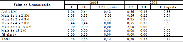 De acordo com a tabela 07, a TCL de emprego formal na agropecuária, segundo a faixa de remuneração, no ano de 2006, apresentou seu maior valor (0,42) quando a faixa de remuneração foi até 1 salário mínimo. Já seu menor valor (-0,22) ocorreu quando a faixa de remuneração ficou de 2 até 4 salários mínimos. Para o ano de 2013, a maior TCL (2,00) se deu na faixa de remuneração de mais de 7 até 15 salários mínimos, enquanto a menor (0,00) figurou em três faixas, a saber: as de mais de 2 até 4 e de mais de 15 salários mínimos. Merece destaque também o caso em que a TC foi estatisticamente igual à TD, não havendo, portanto, TCL. São exemplos deste caso as faixas de remuneração de mais de 4 até 7salários mínimos em 2006, e de mais de 2 até 4 salários mínimos em 2013. Houve também o caso das faixas de remuneração de mais de 15 salários mínimos e de não classificadas, nas quais todas as taxas foram iguais a 0,00 em ambos os anos.