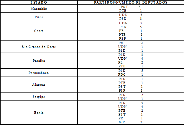 Por sua vez, como recomenda Fernandes (2006), a história dos debates no Congresso sobre a criação do BNB é importante para analisar tanto a solidariedade, quanto os conflitos inter e intra-regionais. Esta abordagem, ou seja, de observar a existência ou não de conflitos ou alinhamentos entre os interesses locais e os nacionais, só se torna possível porque, primeiro, pelo menos nos dois maiores partidos da época[2], PSD e União Democrática Nacional (UDN), ambos ligados às elites urbanas e rurais, havia autonomia dos diretórios estaduais quanto às tomadas de posição no que diz respeito aos interesses locais (BENEVIDES, 1981; HIPPOLITO, 1985). Segundo, porque, pela primeira vez, o sistema político brasileiro era competitivo e os resultados das eleições não estavam definidos a priori, o que exigia dos partidos e seus filiados manter e ampliar seus recursos de toda ordem de modo a serem convertidos em capital político nos enfrentamentos eleitorais (LIMA JÚNIOR, 1981; LIMONGI, 2015).