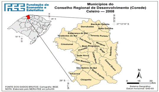 Para verificação empírica dos efeitos dos benefícios previdenciários na economia de municípios, à luz dos aportes teóricos referenciados, pinçou-se a Região do COREDE Celeiro, localizada no noroeste do Estado do Rio Grande do Sul e que abarca 21 municípios de pequeno porte, ou seja, com menos de 25.000 habitantes.