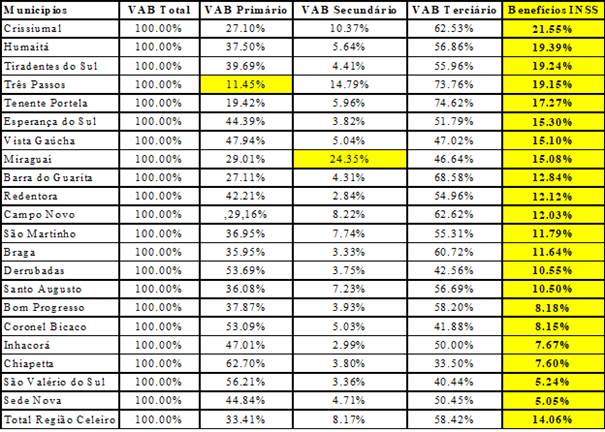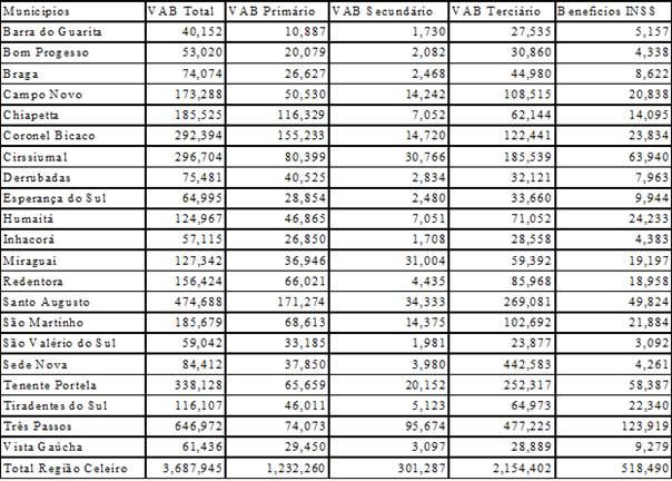 Assim, foram colocados em confronto os indicadores do Valor Adicionado Bruto, VAB, divulgados pelo IBGE, com os dados dos Benefícios pagos pelo INSS nos municípios da Região do COREDE Celeiro. A opção pelo VAB, que se traduz pelo resultado da equação do Produto Interno Bruto - PIB, descontados os impostos, se dá pela oportunidade de avaliação nos setores de produção: primário, que abarca as atividades agropecuária, secundário, que representa as atividades fabris, da indústria da transformação; e, terciário, que envolve as atividades de comércio e serviços, inclusive administração pública.