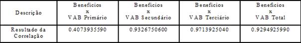 A forte correlação ainda do VAB Total, com 0,929492599, traduz-se de forma inequívoca como a expressão sintetizadora do quadro referenciado por suas atividades econômicas setorizadas. Assim, já neste primeiro tratamento estatístico parece clarificada a correlação da renda recebida com o produto gerado, o que permite apontar com objetividade que os benefícios previdenciários são importantes no dimensionamento econômico local/regional.