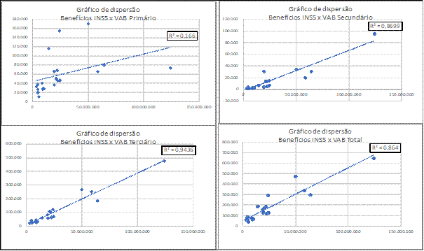Por sua vez, o coeficiente R² = 0,9436 significa que o modelo linear explica em 94,36% o desempenho da variável dependente, as atividades abarcadas nos Serviços, a partir da variável independente, as transferências de rendas previdenciárias. O R² com as atividades primárias se apresenta com apenas 0,166, que somadas aos desempenhos com o VAB Indústria, 0,8699, e com o VAB total 0,864, dão os mesmos sinais de fumaça anteriores.