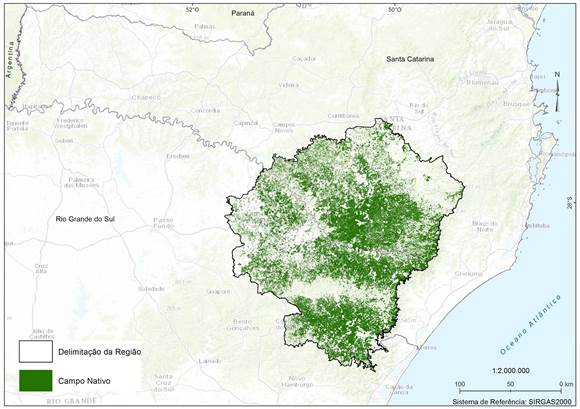 Diante dessas discussões, o estudo mais recente de Trabaquini et al. (2016) apresentou uma metodologia para identificação do campo nativo, onde por meio do uso de imagens de satélite e técnicas de sensoriamento remoto foi possível mapear e estimar a área ocupada pelo campo nativo nos estados de Santa Catarina e Rio Grande do Sul na área delimitada como Campos de Cima da Serra. Na Figura 1, é apresentado o resultado final do mapeamento e quantificação do campo nativo, sendo que a estimativa de ocupação foi de 1.439.900 ha.