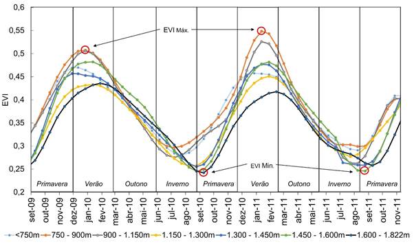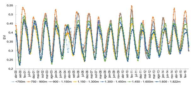 O comportamento sazonal dos campos nativos pode ser observado na Figura 3. Através dos dados da série temporal do índice de vegetação avançado - EVI (Enhanced Vegetation Index) do satélite MODIS, fornecida pelo Laboratório de Agricultura e Floresta do INPE (Instituto Nacional de Pesquisas Espaciais) com tamanho de pixel de 250 m e resolução temporal de 16 dias, foram selecionados 10 pontos com a presença do campo nativo para sete faixas altimétricas (<750; 750-900; 900-1.150; 1.150-1.300; 1.300-1.450; 1.450-1.600; 1.600-1.822m), totalizando 70 amostras, entre o período de 06/04/2000 a 09/06/2016.