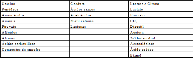 Durante a maturação, as enzimas bacterianas degradam as proteínas e gorduras do leite, produzindo substâncias que dão ao queijo estrutura, aroma e sabor. Assim, a grande variedade de queijos deve-se à combinação das bactérias que se encontram presentes e são específicas de cada produto (MARILLEY; CASEY, 2004). Nos Quadros 1 e 2 são apresentados os compostos e aminoácidos que dão sabor ao queijo segundo Dalla Rosa (2005).
