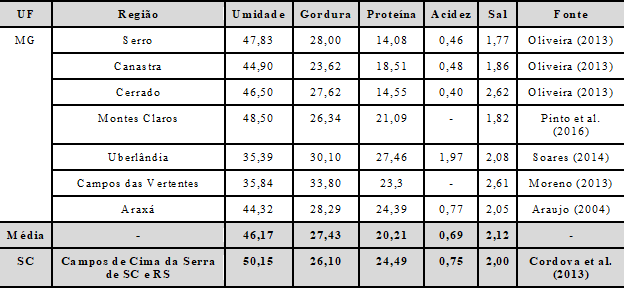 Oliveira et al. (2013) concluem que os queijos Minas Artesanal produzidos nas microrregiões do Serro, Canastra e Cerrado apresentaram diferenças significativas quanto aos teores de proteínas, lipídeos e cloreto de sódio. As variações observadas podem ter sido decorrentes das particularidades das técnicas de produção empregadas, oriundas da tradição e herança cultural de cada região produtora.