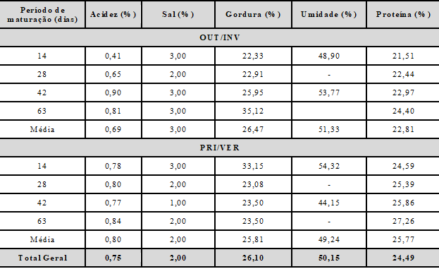 Silveira-Júnior et al. (2012) observaram variações significativas nos parâmetros físico-químicos dos queijos analisados em diferentes épocas do ano como maior teor de umidade e de minerais durante o outono e maiores teores de lipídios, extratos secos totais, gordura no extrato seco, carboidratos e valor calórico durante as estações de verão e de primavera. Na microrregião Campo das Vertentes - MG, os índices de proteólise são mais intensos no período chuvoso e podem sofrer maior influência da temperatura ambiente, mais elevada do que os fatores intrínsecos de composição como teor de umidade, pH e umidade na massa desengordurada do queijo (COSTA JÚNIOR et al., 2014).