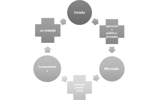 Essa perspectiva de governança reconhece as forças ao redor dos atores sociais em questão: “a capacidade de ação em todas as jurisdições apoiadas pela autoridade do Estado; a mobilização de incentivos humanos básicos através de intercâmbios de mercado; e a implantação de relações solidárias e de conhecimento específico do tempo e espaço incorporado nas comunidades” (LEMOS; AGRAWALL, 2006, p. 310). Na Figura 1 são apresentadas as três principais formas de ações conjuntas, ou estratégias, que os atores sociais constituintes realizam: Co-manejo (agências estatais e comunidades): gestão de recursos naturais baseada na comunidade, etc.; Parcerias público-privadas (agências estatais e atores de mercado): acordos de concessão, indicação geográfica, etc.; e Parcerias privado-sociais (atores de mercado e comunidades): pagamento por serviços ecossistêmicos, ecoturismo, etc.