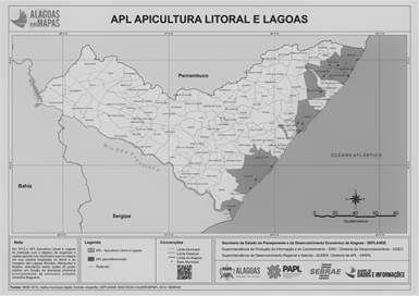 Logo após a concessão da DO, em 2012, o governo do estado de Alagoas instituiu o arranjo produtivo local (APL) - Apicultura Litoral e Lagoas[9] - com o objetivo de “organizar a cadeia apícola nos municípios que os integra em sua maioria localizada no litoral e às margens das Lagoas Mundaú, Manguaba e Roteiro, articulando assim ações do poder público em função da demanda produtiva principalmente da exclusiva própolis vermelha alagoana” (ALAGOAS. SEPLANDE, 2014) (Figura 4). Constitutindo assim, mais outro exemplo de parceria público-privada no processo de governança ambiental em torno da região do litoral e lagoas do estado de Alagoas, Brasil.