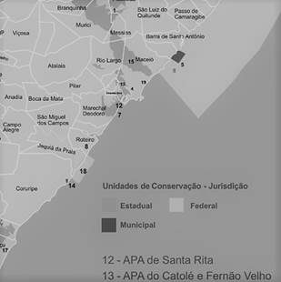 Um outro elemento importante de análise referente à governança ambiental aqui retratada é que essa região, cuja atividade da apicultura vem sendo desenvolvida, está inserida dentro de duas áreas de proteção ambiental sob jurisdição estadual, APA de Santa Rita e APA do Catolé e Fernão Velho (10.230 ha e 5.415 ha, respectivamente). A área abrange os municípios de Maceió, Marechal Deodoro, Santa Luzia do Norte, Satuba e Coqueiro Seco (Figura 5).