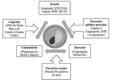 Dessa forma, as APAs buscam um modelo de gestão participativa para disciplinar o aproveitamento dos recursos ambientais, caracterizando assim uma cogestão (Estado e comunidade) presente no esquema de estratégias de governança ambiental apresentado anteriormente na Figura 1. Nessa perspectiva, evidencia-se que a DO dada à própolis vermelha de Alagoas constitui-se uma ação conjunta entre o Estado e o mercado, que estimulou parcerias e que vem ampliando o número de agentes envolvidos no processo de governança ambiental da região do litoral e manguezal alagoano.