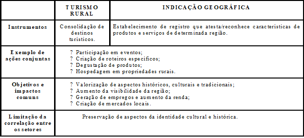 Ou seja, o limitante para o estabelecimento de ações e estratégias transversais entre o turismo e as indicações geográficas é a salvaguarda da identidade histórica e cultural das comunidades onde se espera atuar. De modo sintético, temos a relação entre os conceitos explicitada no Quadro 1.