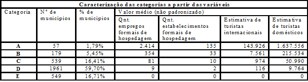 A categorização tem por objetivo classificar as regiões de acordo com o desenvolvimento turístico. Por meio da análise de cluster foram observados os seguintes parâmetros: o número de estabelecimentos formais cuja principal atividade é a hospedagem, número de empregos formais no setor de hospedagem e a expectativa de fluxo turístico doméstico e internacional. De acordo com esses aspectos os municípios foram organizados em “A”, “B”, “C”, “D” e “E”. Os resultados dessa análise são sintetizados na Quadro 2.