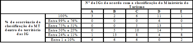 Cada município identificado pertencente a uma área geográfica de uma IG foi assim categorizado segundo a classificação do ministério do turismo. Desta forma foi possível identificar quais tipos de municípios constituiu a área de uma IG. Se por exemplo todos os municípios pertenciam todos a mesma categoria ou a categorias diferentes. Para melhor organização dos dados, as classificações dos municípios foram agrupadas em percentuais, devido ao grande número de municípios que são contemplados nas áreas de algumas IG´s.