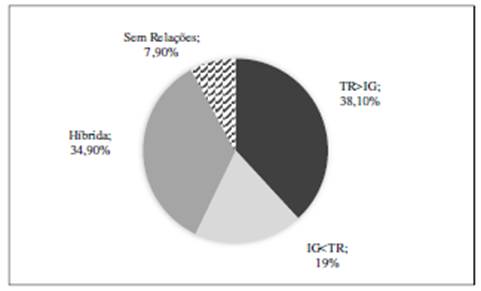 Identificamos que as relações de interação entre as indicações geográficas concentram-se principalmente naquelas onde o turismo é o principal atrativo da região geográfica, impulsionando o conhecimento e consumo de produtos ou serviços da IG (TR>IG, 38,1%). Outra relação significativa expressa a presença de interações híbridas (34,9%). A influência das IG sobre o turismo rural no Brasil é ainda pouco representativa (19%).