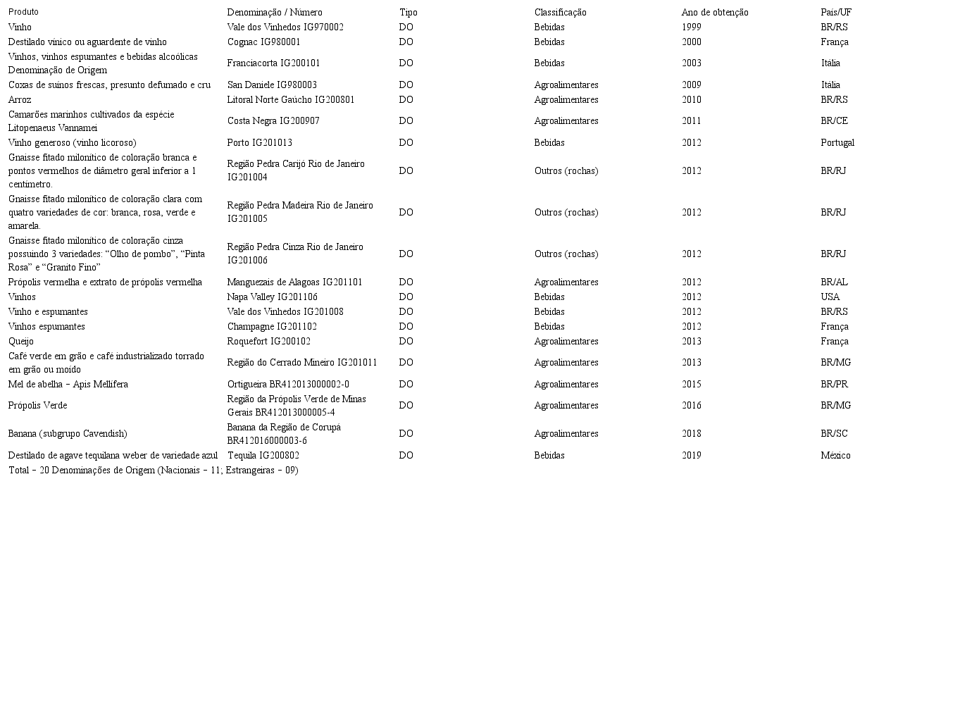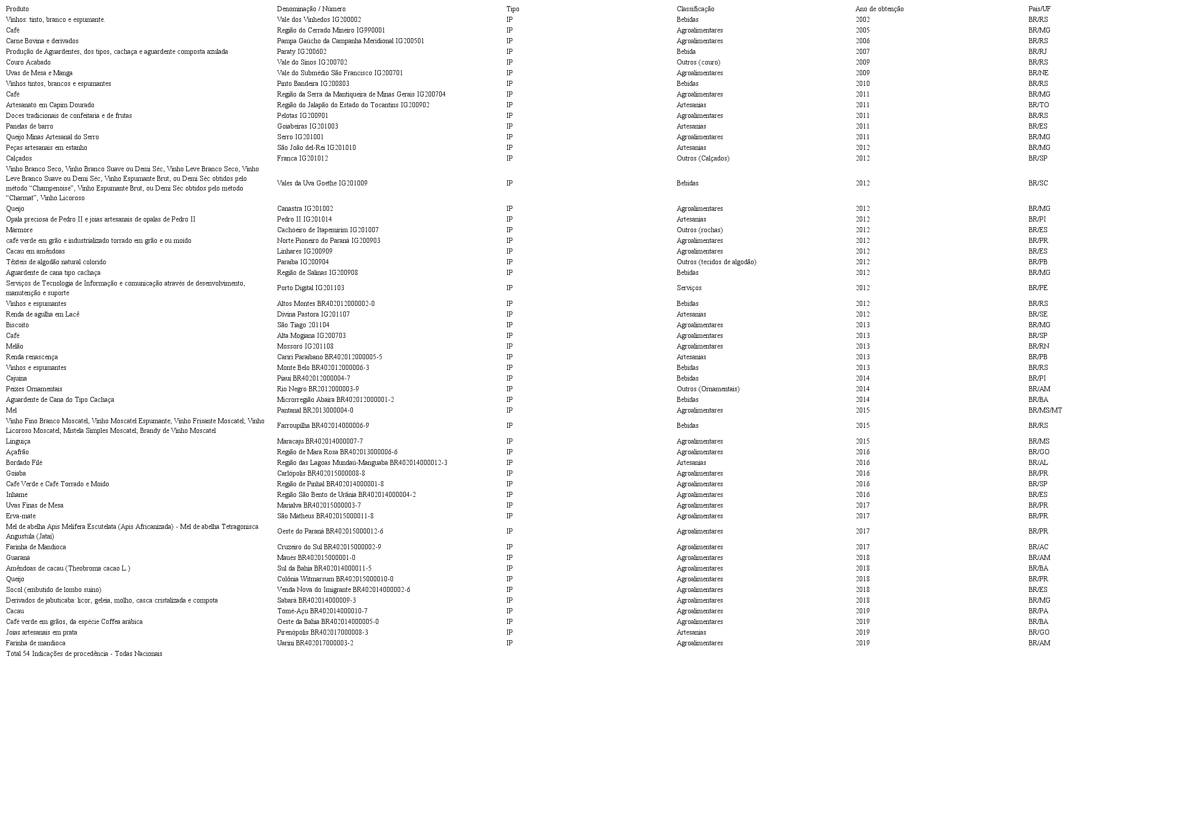 Atualmente estão registradas no Brasil 74 indicações geográficas que serão apresentadas a seguir, nos Quadros 1 e 2, de onde se observa: 20 Denominações de origem, sendo 11 nacionais e 9 estrangeiras e 54 Indicações de procedência.