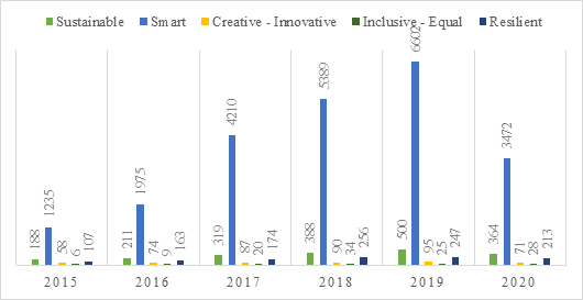 Como o tema brandings de cidades envolve inúmeros aspectos, a pesquisa delimita uma amostra intencional de definições que são: sustentáveis, inteligentes, criativas, inovadoras, inclusivas, igualitárias e resilientes. A aplicação de amostra intencional permite um aprofundamento maior dos conteúdos selecionados (GIL, 2002). Esses brandings são os mais citados em um levantamento bibliográfico inicial nas bases Scopus e Web of Science dos termos “cities” e “brandings”, que totalizaram 180 e 323 referências respectivamente, no período de 2015 a 2020². A partir desse levantamento é definido a amostra intencional e realizado a pesquisa bibliográfica e documental dos termos: “sustainable cities”, “smart cities”, “creative cities”, “innovative cities”, “inclusive cities”, “equal cities” e “resilient cities”. Os conceitos selecionados são os mais referenciados também pela United Nations, European Commission, World Bank e Organization for Economic Co-operation and Development. A Figura 1 demonstra a evolução dos artigos publicados entre 2015 e 2020[2], referente às abordagens às cidades e espaços urbanos selecionados da base Scopus, que apresenta o maior número de trabalhos publicados relacionados a cada conceitualização entre as bases pesquisadas Scopus e Web of Science indexadas no Portal de Periódicos Capes.