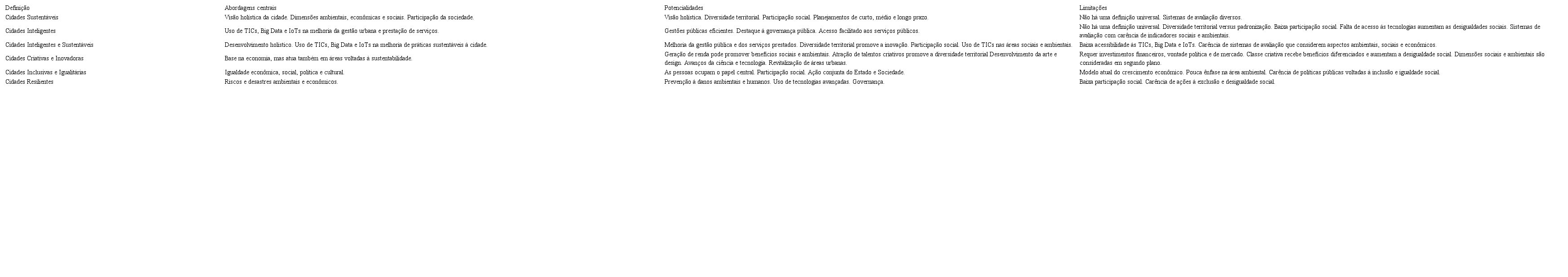 Pode-se observar que todo o processo de políticas públicas necessita ser baseada num olhar para o desenvolvimento sustentável da cidade, com inteligência, criatividade e inovação, bem como, de inclusão e igualdade social e resiliência. O Quadro 1 sintetiza o resultado das principais análises realizadas a partir dos conceitos desenvolvidos nesse estudo. A comparação se sustentou nas abordagens centrais, nas potencialidades do uso dos termos e das respectivas limitações.