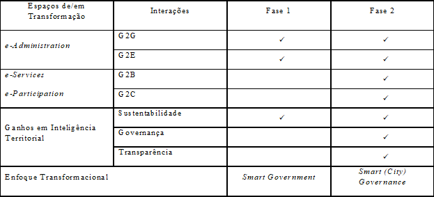 No quadro 1 das três gerações de Smart Cities apresentadas (COHEN, 2015), este projeto pode, assim, ser enquadrado como estando a meio caminho entre a transição de uma infraestruturação tecnológica (Smart Cities 1.0) e uma segunda geração, em que há já uma digitalização integrada como suporte ao planejamento estratégico urbano (Smart Cities 2.0). Ou seja, quando atentamos nos três enfoques referidos por Bencardino e Greco (2014), este projeto evidencia ainda uma ênfase nas condições tecnológicas (tecno-centrada), antevendo, no entanto, uma fase posterior centrada nas pessoas e integrada ao nível estratégico da cidade. Tais fases parecem demonstrar uma lógica sequencial e incremental dependente de um conjunto de pequenas mudanças (acupuntura digital) que possibilitem as condições para que uma verdadeira transformação possa acontecer no futuro (Smart City Governance). Essa sequência ilustra também a interdependência operativa do processo de transição digital mediada por um alargamento das interações governativas que estão na base da evolução conceptual entre o Smart Government, a Smart Governance e a Smart City Governance (PEREIRA, et al., 2018).