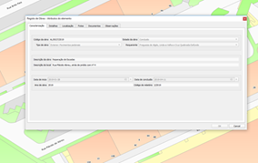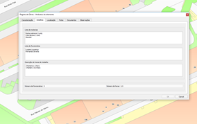 A Figura 6 apresenta o formulário de obra 1. Este formulário aparece quando se coloca o ponto com a localização da intervenção e pretende caraterizar os atributos do elemento. No campo da caraterização é atribuído um código de obra, para que a mesma disponha de uma referenciação, tornando mais simplificada uma pesquisa futura e passível uma recolha de indicadores por freguesia, uma vez que este código se altera mediante a freguesia intervencionada. Um outro campo classifica o estado da obra, que pode versar entre: “Sem Informação”; “Previsto”; “Em Execução”; “Concluído”; e “Cancelado”. Criou-se igualmente mais oito campos caraterizadores da obra, designadamente: “Tipo de Obra” (previamente definido de acordo com o protocolo de delegação de competência em vigor); “Requerente”; “Descrição da Obra”; “Descrição do Local”; “Data de Início”; “Data de Conclusão”; “Ano da Obra”; e “Código do Relatório”. A segunda aba do formulário de obra (Figura 7) serve para especificar os detalhes da intervenção. Aqui são discriminados os materiais utilizados e respetivas quantidades, assim como funcionários envolvidos e horas de trabalho correspondentes.
