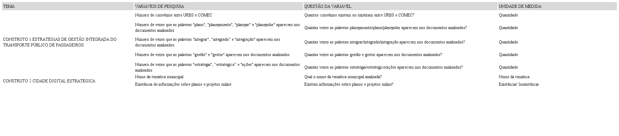 A análise dos documentos foi feita com base em um protocolo de pesquisa, que é constituído de dois construtos com 7 variáveis (YIN, 2010), como mostra o quadro 4: