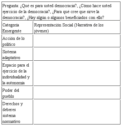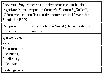 En lo relacionado a las representaciones sociales de democracia se diseñaron guías para la realización de los grupos focales, asimismo, entrevistas semiestructuradas y análisis de contenido.