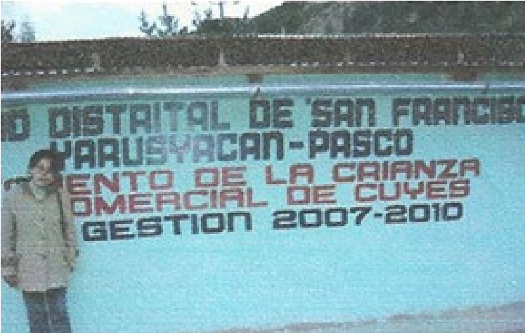 Acerca de la crianza de cuyes y conejos se llevó acabo la crianza intensiva de ocho (08) cuyes machos, siendo cuatro (04) del Tipo “A” y cuatro (04) del Tipo “B” y 32 hembras en ambos casos en la fase de recría que fueron criados en un galpón de 63 m2, de largo 9 m y de ancho 7 m, en pozas de 1 m de largo x 1 m de ancho x 0.6 m de profundidad, y para las camas se empleó paja, panca de maíz y coronta molido. (Fig.12).