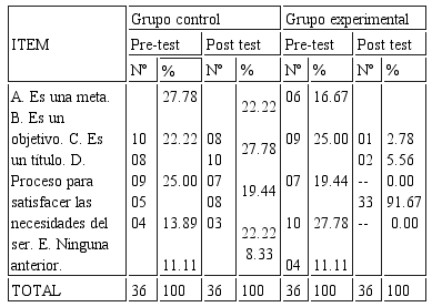 Análisis: En el grupo control pre-test 05 (13.89%) y post test 08 (22.22%), los estudiantes tenían el concepto de educación productiva en menor proporción, mientras que en el grupo experimental pre-test 10 (27.78%) contestaron positivamente y en el post test 33 (91.67%) contestaron eficientemente sobre el ítem planteado, siendo altamente significativo, lo que demuestra en los estudiantes el desarrollo de capacidades cognitivas.