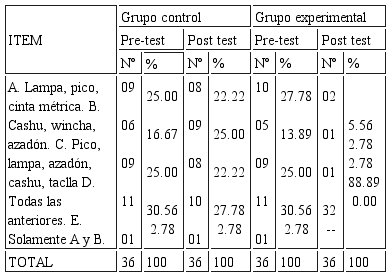 Análisis: En el grupo control pre-test 11 (30.56%) y post test 10 (27.78%), los estudiantes opinaron que conocen algunas herramientas agrícolas, mientras que en el grupo experimental pre-test 11 (30.56%) y post test 32 (88.89%) llegaron a conocer eficientemente dichas herramientas, siendo el resultado altamente significativo, demostrando los estudiantes sus capacidades cognitivas y destrezas motoras para operar las herramienta agrícolas.