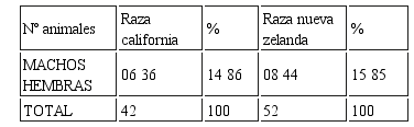 Interpretación: El grupo control arrojó 42 conejos entre machos y hembras de la Raza California con (14 y 36%), y el grupo experimental demostró ser más productivo, puesto que se logró 52 conejos de la raza Nueva Zelanda con (15 y 85%). Fue óptima su crianza, por presentar una carne de excelente calidad, de fácil digestión, con bajo colesterol, alimento indispensable para los pobladores de altura. Su alimentación estuvo basada en base a forrajes, concentrados, agua limpia y fresca, no hubo plagas ni enfermedades durante la investigación desarrollada.