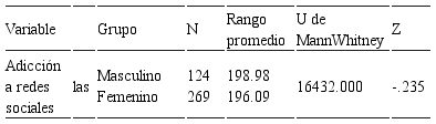 De otro lado, la variable adicción a las redes sociales no obtuvo diferencias significativas según sexo (véase Tabla 9).