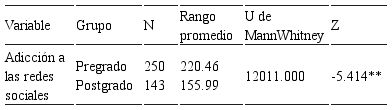 De igual manera, se halló diferencias significativas de adicción a las redes sociales según el nivel de estudio, a favor de los estudiantes de pre-grado (véase Tabla 11).