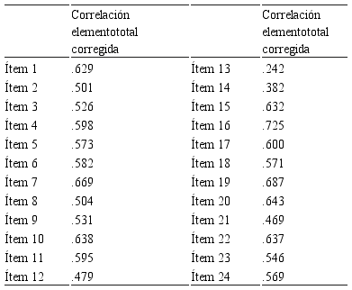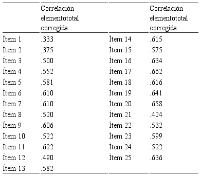 La Escala de Procrastinación presenta 30 ítems de opción múltiple[1]. El análisis de consistencia interna más apropiado se realizó por medio del coeficiente alfa de Cronbach (Kerlinger & Lee, 2002). En primer lugar, se analizó la unidimensionalidad de la escala y, posterior al análisis de validez factorial, se determinó la consistencia interna de sus dimensiones. La confiabilidad determinada fue de .927, ver Tabla 2, considerado un nivel elevado de consistencia interna (Murphy & Davishofer; como se citó en Hogan, 2004). Los índices de correlación ítem-test son superiores a .300 en todos los casos, por lo que todos los ítems fueron conservados para un posterior análisis.