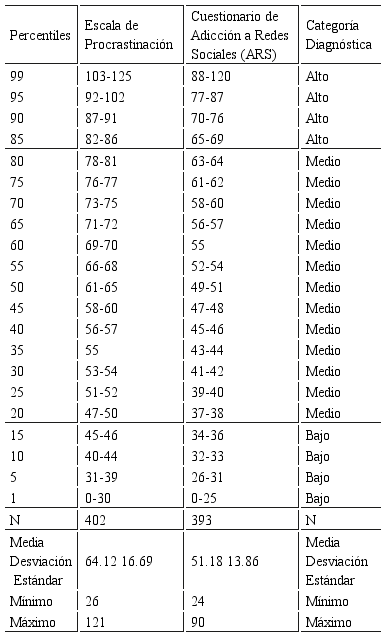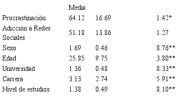 El análisis descriptivo de las variables del estudio (procrastinación y adicción a redes soaciales) fue realizado contrastando la muestra de pregrado y postgrado, debido a que las medias de edad entre ambas fue 16 años (Xpregrado=19.9; Xpostgrado=35.6).